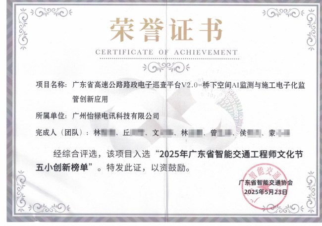 广州怡禄电讯科技有限公司再传捷报!在2025年广东省智能交通协会文化节上,我司自主研发的"路政电子巡查平台桥下空间AI监测与施工电子化监管创新应用"项目,从众多优秀参评项目中脱颖而出,荣获"五小创新发明"奖项!
